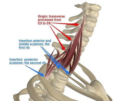 前斜角肌起点附着于C3—6的横突前结节,止点附着于第一肋骨内缘以及锁骨下动脉前方、锁骨下静脉后方以及膈神经后方;最大的中斜角肌起点附着于C2—7的横突后结节,止点附着于第一肋骨上缘以及锁骨下动脉横沟的深处,前斜角肌附着点的后方;后斜角肌起点附着于C5—7的横突后结节,止点附着于第二肋骨外表面,它位于中斜角肌之后,上斜方肌与肩胛提肌前缘的深部;