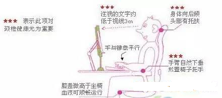 行走要挺胸抬头,两眼平视前方,坐要坐直,不要躺在床上看书;喝水、刮胡子、洗脸不要过分仰头,缝纫、绣花机其他手工劳作不要过分低头,看电视时电视机应放在与眼睛同一平面上;切菜、剁馅、包饺子等家务劳动,时间不宜太长,要经常改变姿势。